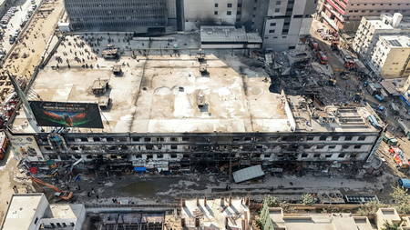 〔写真説明〕大規模火災で焼け焦げたショッピングモール=21日、パキスタン南部カラチ(AFP時事)