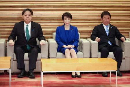 〔写真説明〕閣議に臨む高市早苗首相(中央)ら=23日午前、首相官邸