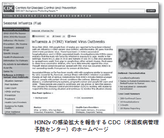 本年8月に、米国のいくつかの州で豚インフルエンザ H3N2vが人に感染する例が合計 200 人以上報告された。このウィルスは、香港インフルエンザ H3N2 に 09 年に発生したパンデミックインフルエンザの遺伝子が交雑したものと考えられており、農業見本市などで生きた豚と濃厚に接触した子供が多 く感染・発症したもののようである。その病原性は弱く、人から人に感染する力も弱いようであり、幸いなことに現段階大きな問題とはみなされていないが、注意深くフォローする必要がある。