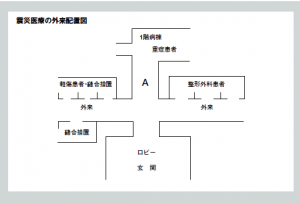 外来患者には透析室を開放し、その部署を重傷者の診察場にすることで対応した。重傷者以外は、通常の内科、外科の外来を開放し、整形外科の診察場と、一般の外来患者用の部屋を設けた(図)。