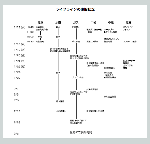 ち なみに、火災被害を多く受けた長田区の近くに位置する神戸大学医学部付属病院は900床を超える大病院だが、押し寄せた外来患者数は震災当初3日間で 698人、うち147人が入院と、甲南病院の約半数にとどまる。この結果からも甲南病院がいかに大変な状況だったかがうかがえる。