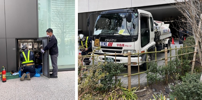 実証実験は一昨年11月に静岡・三島市で行って以降2回目。燃料配送協力会社の三和エナジーが横浜市港北区の拠点から約6キロ離れたみなとみらい地区に中型タンクローリーで重油を運搬、神奈川大学みなとみらいキャンパス、横浜コネクトスクエア、クイーンズスクエア横浜、神奈川県警友会けいゆう病院の4施設に模擬給油を行い、結果を検証した。