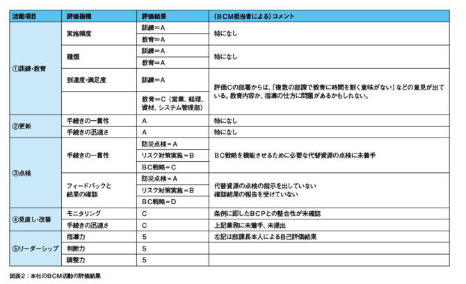 以上の評価は、さまざま考えられる方法の1つに過ぎません。ここでは便宜上、本社と3つのサービス事業部すべてのBCM活動を、本社BCM事務局のAさんがとりまとめる形になっていますが、本来ならば、本社、各事業部の活動をそれぞれ1つの単位として、独立的に評価する方が自然でしょう。