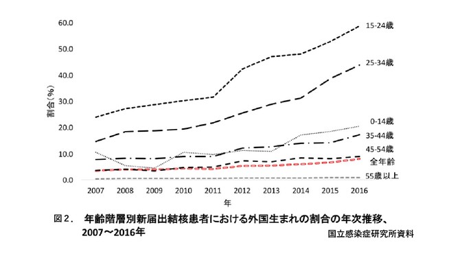 日本国内における新届出の結核患者総数における外国生まれの患者の比率は、近年、増加傾向にあります。国立感染症研究所においてまとめられたデータを図2に示しましたが、この図から、年齢階層別に見てみると全ての年齢階層において、年々、外国生まれの人の結核患者数の割合の増加していることが分かります。特に、15~24歳の若い年齢層の新届出結核患者における外国生まれの割合の増加の顕著であることが明白です。2016年には、ヨーロッパ先進諸国並みの過半数を超える58.6%(471/ 804)に達しているのです。