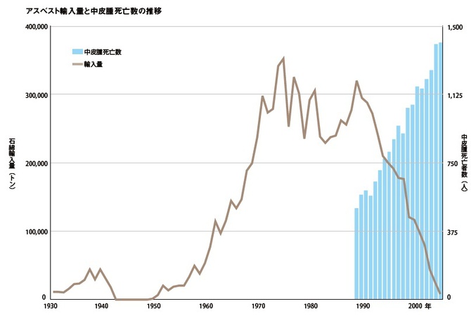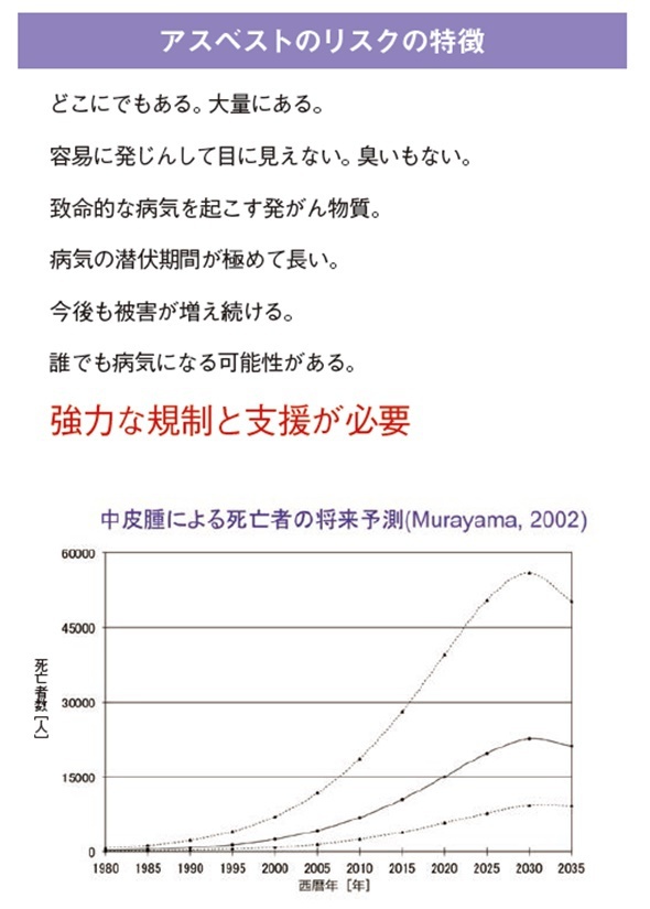 2002年に発表された早稲田大学の村山先生の予測によると死亡者のピークは2030年頃で1年間に約4000人が中皮腫で亡くなるとしています。この頃亡くなる人がアスベストの曝露を開始したのは1990年頃。今のように防塵マスクや湿潤化の対策を考える以前のことです。40年後のためにお金をかけて対策をしましょうというのは、一企業、一個人の力でできるかというとなかなか難しいでしょう。やはり国がきちんと規制をしなければいけないと思います。