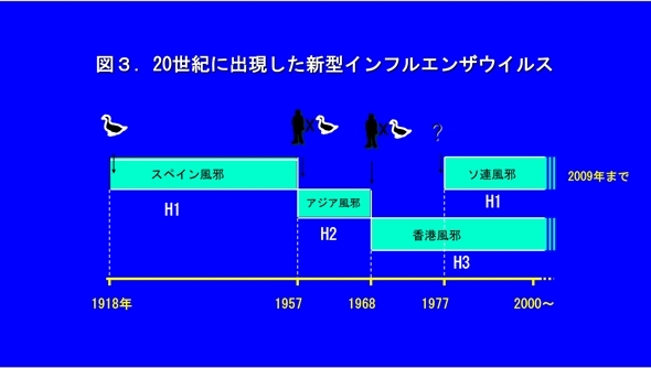 分子遺伝学的な研究から、20世紀に出現した新型インフルエンザウイルスは、それまで世界中の人に感染し続けてきたインフルエンザウイルスと、別のHA、NA亜型の鳥インフルエンザウイルスの遺伝子が入り混じった、人に対して強い感染力と病原性を持つ、新たな性状を獲得した、遺伝子再集合体であったことが分かっています(図3)。