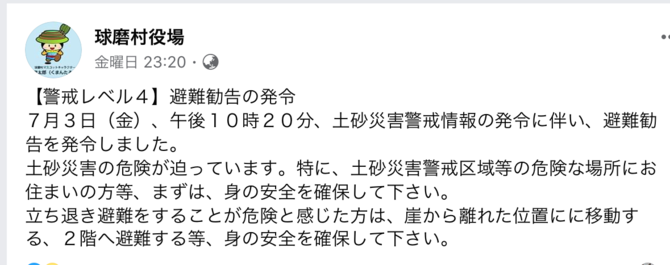 球磨村で警戒レベル3情報「避難準備・高齢者等避難開始」が出されたのは、7月3日の17時でした。