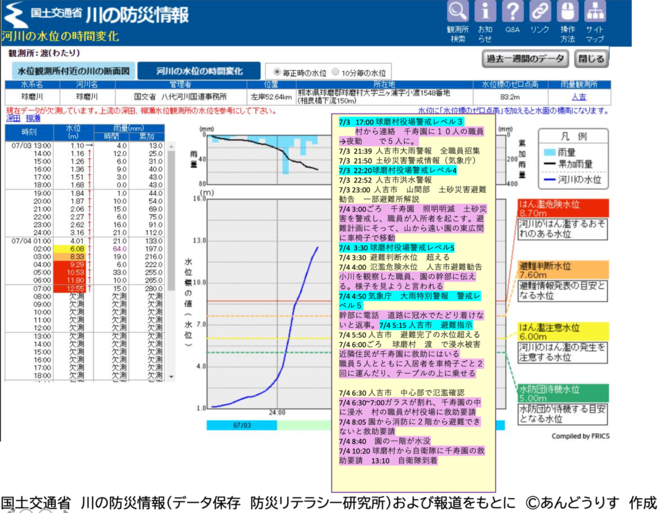 報道資料と国土交通省「川の防災情報」の当日の資料で、時系列を作ってみました。