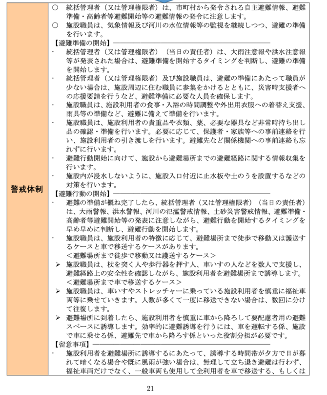 このことから分かるのは、作成マニュアルに沿って避難確保計画を作れば、高齢者施設は「避難準備・高齢者等避難開始で避難」というマニュアルが自動的に出来上がります。