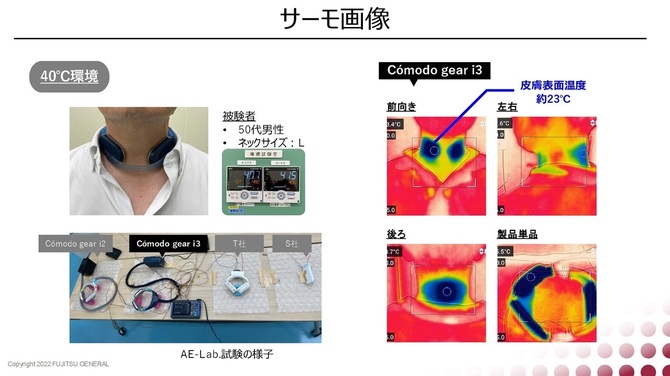 実際に50代男性にウェアラブルエアコンを装着してもらい、現場想定の環境温度に対し皮膚の表面温度は17℃低くなった(40℃環境で表面温度23℃)という結果が出ています。