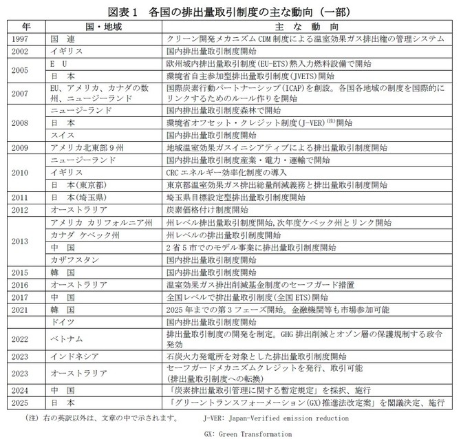 図表1は、1997年国連が、クリーン開発メカニズムCDM制度による温室効果ガス排出権の管理システムを創設してから、2024年までの各国の排出量取引制度の主な動向の一部を示しています。世界の国が、積極的に排出量取引制度を採用していることがわかります。