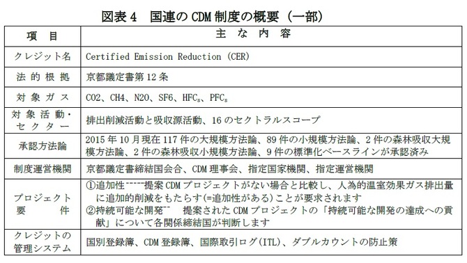 日本は、議定書で約束期間(2008年から2012年)に温暖化ガス排出量を1990年比で6%減少しなければならないため、このシステムを介した排出権取引を利用しています。また、EUもこのシステムに参加しています。国連は登録された排出量で、各国が排出量削減の目標を達成しているかを判断します。国連のCDM制度の概要は、図表4のとおりです。