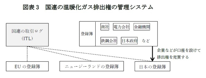 図表3では、国連の取引ログシステム内に、自国の排出量を管理する登録簿を加盟国が作り、登録簿のなかに政府や民間企業が個別に口座を設けて、排出権を売買することが示されています。