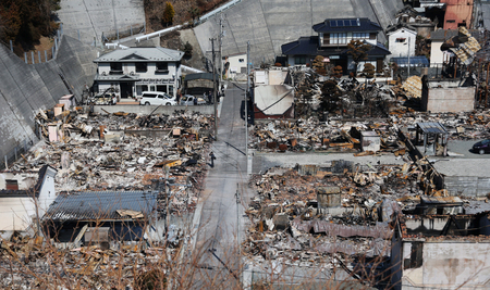 〔写真説明〕山林火災で焼けた集落=11日、岩手県大船渡市