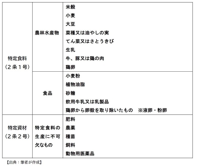 まず、食料供給困難事態対策法(以下、単に「法」と表記)において重要な文言として、「特定食料」(2条1号)と「特定資材」(2条2号)とがあります。これらについては、法に定義規定が置かれた上で、施行令1・2条で具体的に定められています。これらにつき、適宜、簡略化するなどしてまとめると、下表のようになります。