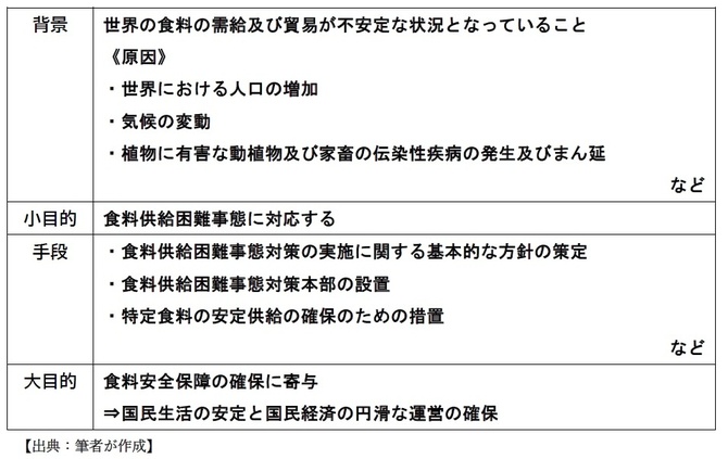「食料供給困難事態」と聞くと、少しおどろおどろしく感じられ、警戒や敬遠をしてしまいそうになりますが、同法の目的規定(1条)を分析的に読めば、下表のような背景、手段、目的等に整理できるように思われます。