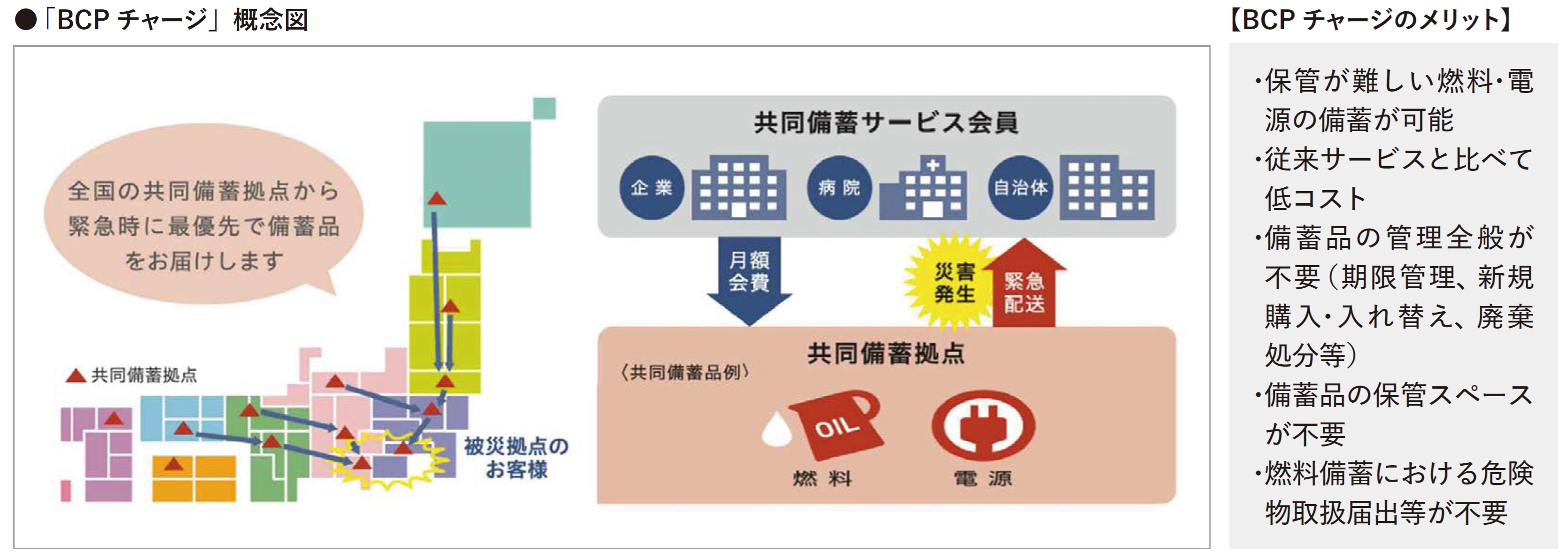 企業がエネルギー事業者と取り交わす災害時の燃料配送契約を、同社が間に入って取りまとめる。複数の企業が集まって発電用燃料を一定量確保し、保管・管理コストをシェアすることで費用負担を抑える仕組み。燃料事業者と個別の契約が難しい中堅・中小企業でも、いざというときに備えられる。