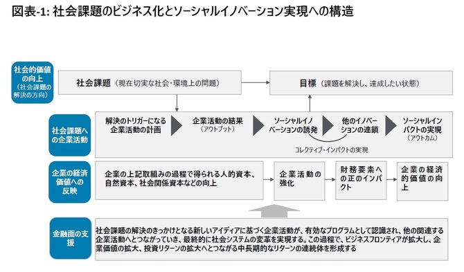 社会課題に対してビジネスを通じた解決への貢献を企図する企業は、自社の活動(アウトプット)を最終的に社会的イノベーションにつなげ、何らかの形で社会システムの改善を果たそうとする。必然的に多数の関連する企業活動や地域社会の関係者の活動を誘発する必要がある。また、このような中長期的活動を継続するためには、活動を資金面で支える金融機能の支援を実現しなければならない。このように、社会課題解決のために多くの関係者が協働して成果を発揮する状況を、集合的効果(コレクティブ・インパクト)と呼んでいる。つまり、社会課題のビジネス化の取り組みは、コレクティブ・インパクトを誘発し、社会的インパクト(アウトカム)を実現する流れとして、図表-1のように整理できる。