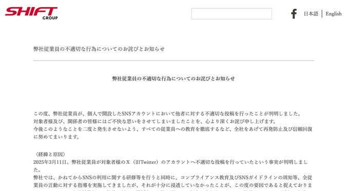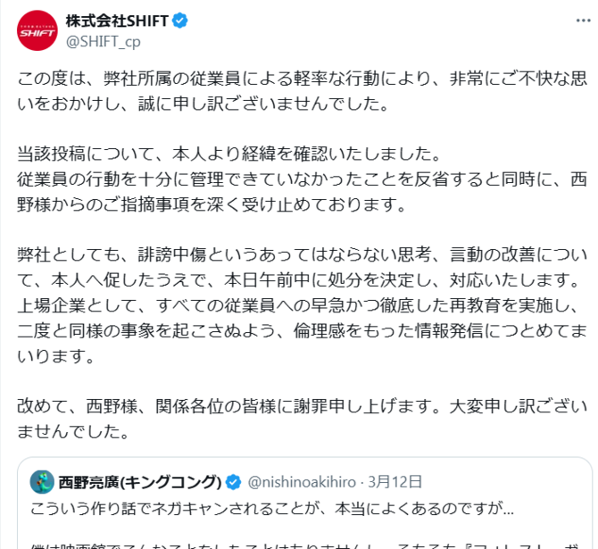 SHIFT社は即日、公式Xアカウントで謝罪しました。