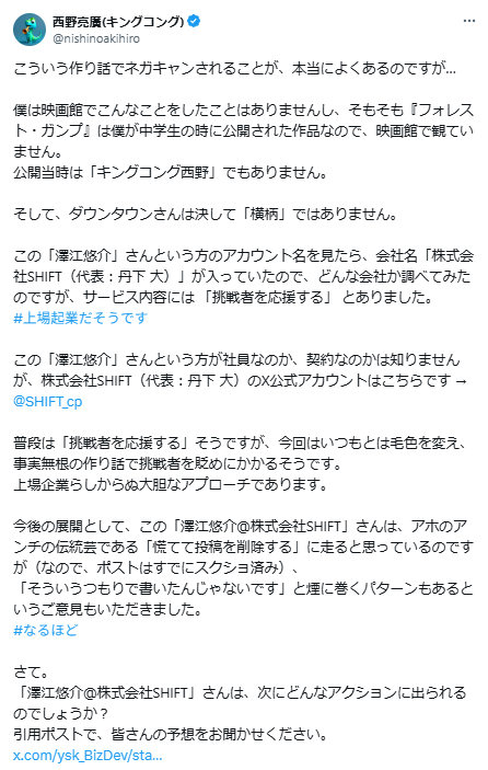 西野氏は投稿主の所属企業名に言及したうえで、SHIFTが掲げる「挑戦者を応援する」というスローガンを引用しながら、「事実無根の作り話で挑戦者を貶めにかかる」姿勢に、上場企業としての倫理を問いました。
