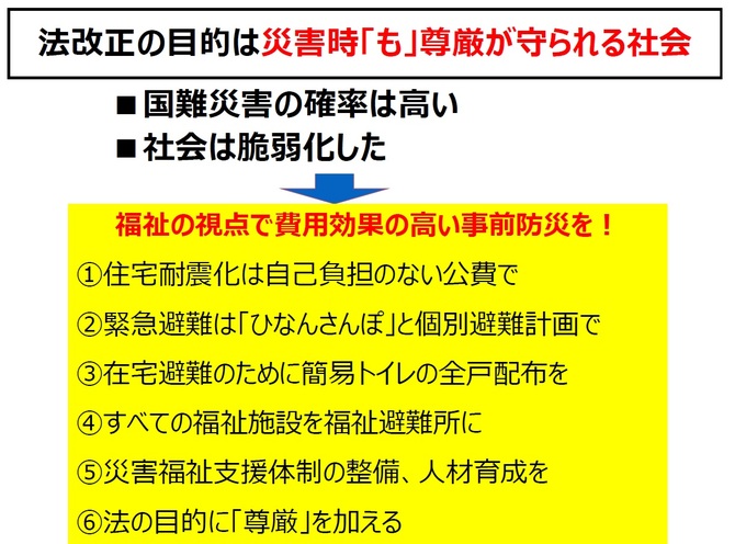 陳述時間は15分と短いが、法改正の目的を「災害時『も』尊厳が守られる社会へ」ととらえ、多くの資料を集めて整理し、法改正すべき2つの背景と、改正後に実施すべきと考える6つの政策提案を行った。