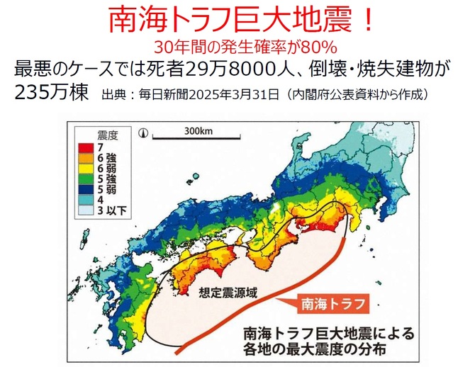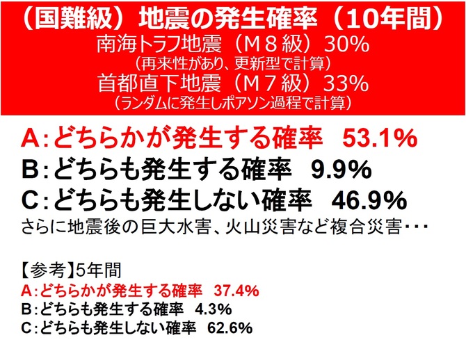 なんと、10年以内にどちらかが発生する確率は53.1%と5割を超え、両方が発生する確率も9.9%ある。さらに、この数式を5年にあてはめると、どちらかが発生する確率は37.4%だ。国難災害となるかもしれない地震の発生は極めて切迫している。