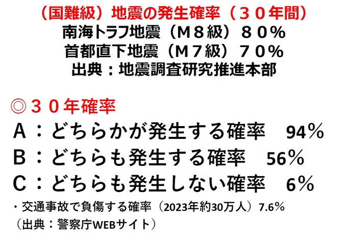 よく知られているように、国難級地震の発生確率(30年間)は「南海トラフ地震(M8級)80%」「首都直下地震(M7級)70%」(出典:地震調査研究推進本部)である。確かに、地震学では南海トラフ地震と首都直下地震は別の地震であるが、社会的にはどちらの地震が来ても大きな被害を受けることになる。とすれば、社会がダメージを受ける確率として、どちらかでも発生する確率でとらえるべきだろう。