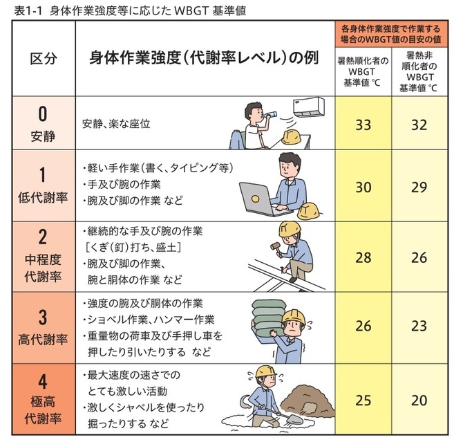 「職場における熱中症予防基本対策要項」では、身体作業強度に応じたWBGT (暑さ指数)の基準値を示し、基準値を超えた際のWBGT自体の低減、または身体作業強度の低い作業への変更などを求めています。