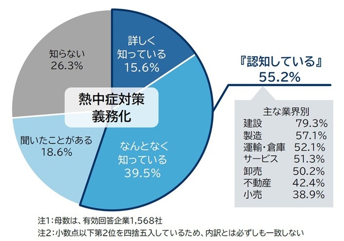 事業者が上記の対策の実施を怠った場合、6月以下の拘禁刑、または50万円以下の罰金が科される可能性があります。しかしながら、帝国データバンクが実施した調査によると、改正労働安全衛生規則による事業者の義務についての認知率は55.2%にとどまっており、「知らない」が26.3%になっています。また、業種別では、建設業では約8割が認知している一方で、製造業、運輸・倉庫業、サービス業、卸売業では5割程度、不動産業や小売業では4割前後となっており、業種間で認知率に差が生じています。
