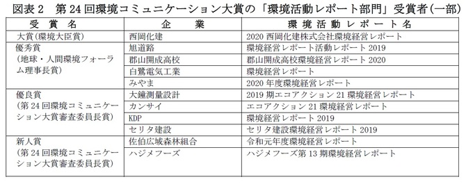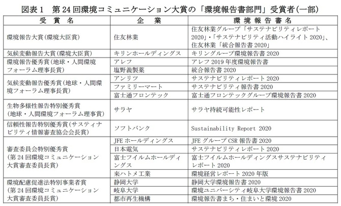 2020年度第24回環境コミュニケーション大賞の「環境報告書部門」受賞者の一部を紹介しますと、図表1のとおりです。
