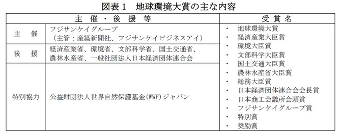 地球環境大賞は、フジサンケイグループが、産業の発展と地球環境との共生をめざし、産業界を対象とする顕彰制度として世界自然保護基金ジャパン(WWF Japan: World Wide Fund for Nature Japan)の特別協力を得て創設されました。地球環境大賞の主な内容は、図表1のとおりです。