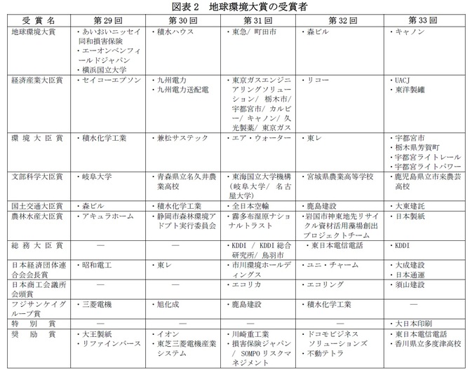 図表2をみますと、第31回からは、「総務大臣賞」と「日本商工会議所会頭賞」が追加され、第33回からは、「特別賞」が追加されています。国民に対する地球環境への保全意識を高めたいという目的が伝わってきます。