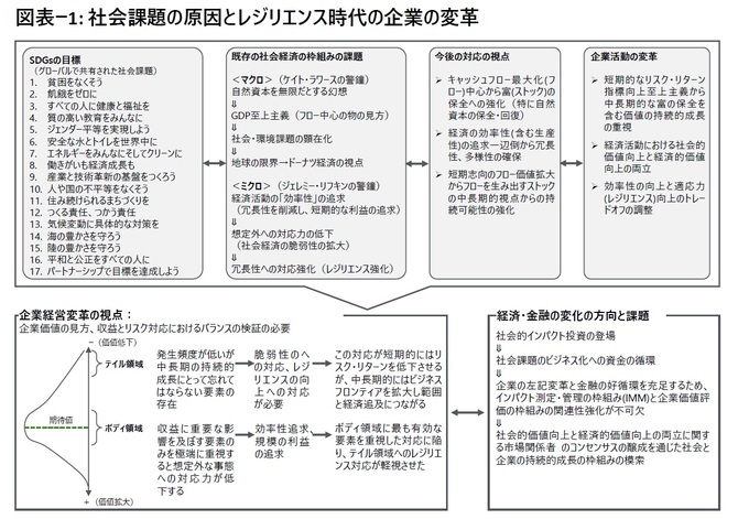 企業は、これまで市場メカニズムに組み込まれた財務要素を中心に経営を行ってきた。しかし今後は、社会課題の解決に関わる非財務要素を考慮の対象にし、中長期的視点で社会と企業の持続的発展を両立させなければならない。これは、経営にとっては、財務要素に加え非財務要素を経営管理に実装し、短期的成果と中長期的成果をバランスさせ、企業の持続的成長と社会課題の解決、持続的発展を同期づける活動に腐心することを意味する。ただ、これまで経験の少なかった領域であることは間違いなく、不確実性の高い領域への対応となる。当然、持続的発展を可能にする戦略策定とレジリエンスを強化するリスク管理の具体策を模索してゆく時代に突入したことを意味する。