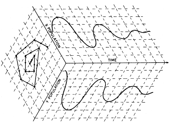 Xの個体数が減ってからYの個体数が減るまでの間には若干の遅れがあるため、XとYとが交互に増減する波型になると考えられるが、上図では増減のサイクルを繰り返しながら一定の平衡状態に向かって収束していく様子が描かれている。この場合、XとYとの交点を左側の面にプロットするとその軌跡は渦巻状に回りながら中心点に向かっていくような軌跡を描く。