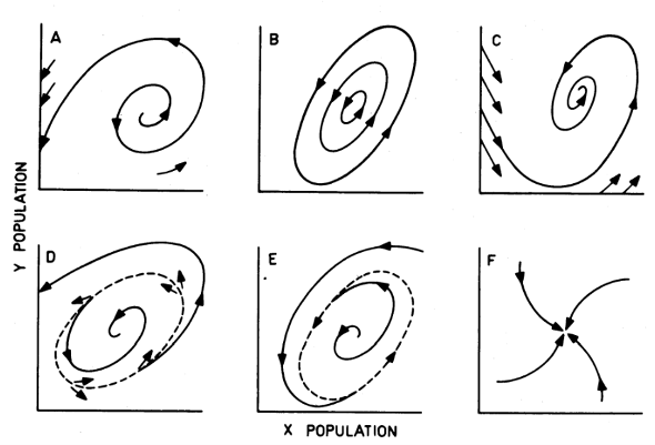しかしながら実際の生態系では、必ずしも上図のように平衡状態に向かうとは限らない。図1は平衡状態にならない可能性を含めて、図の左側の面にどのような軌跡が現れうるか例示されたものである。これらのうちBは最も安定した状態であり、一定の範囲で増減を繰り返しながら平衡状態が続く様子を表している。