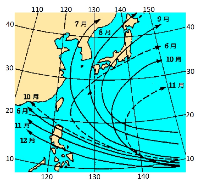 図2は、本連載でこれまで何度も引用した台風経路の概念図で、気象庁ホームページに載っているものである。この図では、7月の台風経路の線が1本しか描かれていない。図1ほどのばらつきと広がりを見せる7月の台風経路を、図2では1本の線だけで代表させているのだから乱暴な話だ。とはいえ、フィリピンの東から北西進する部分は図1の赤表示の連なりに大体沿っているし、北緯30度あたりで西進成分がなくなり、それより北で東進成分を持つように描かれているのも急所を押さえている。