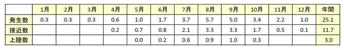 表1に、台風の月別平年値の統計を示す。発生数、接近数、上陸数のどれをとっても、8月から9月にかけて最多となっており、この2カ月間が台風シーズンのピークである。7月は台風シーズンの始まりにあたる。7月の台風発生数の平年値は3.7個で、6月(1.7個)の2倍以上に増える。つまり、台風シーズンの到来とともに、台風が次々と発生し始める。1月~6月の各月の発生数の平年値を合計すると4.2になるから、7月に発生する台風は第5号~第8号くらいが普通のペースだ。7月中に第10号まで発生すれば、平年より多めということになる。今年(2025年)は、本稿を執筆中の7月23日現在で第8号まで発生した。