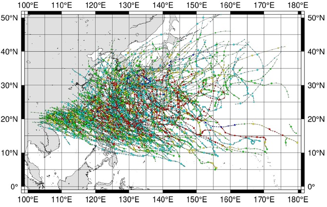 図1は、1951年以降の7月に発生したすべての台風の経路を、地図上に重ね書きしたものである。7月ともなると、発生数がだいぶ増えてきて、日本の南海上と東シナ海、フィリピンの東海上、それに南シナ海の北半分は、台風経路のすき間がほとんど見られない。このうち、フィリピンの東海上から沖縄及び台湾の近海にかけては赤色が目立ち、強度階級「強い」以上の台風の存在頻度が相対的に高い領域である。