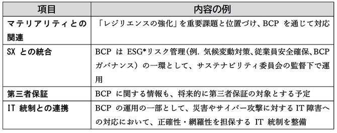 このサステナビリティ情報には「マテリアリティ(企業の価値創造やリスク・機会に大きな影響を与える事項として、戦略策定において「重要な課題」を特定するための概念)」という考え方が含まれ、各BCP要素に対して以下のような関係性を持っています。