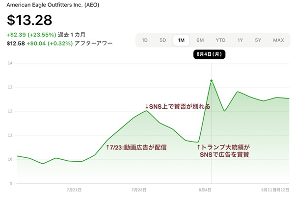 しかしその後、事態は思わぬ方向に転がりました。炎上が加速する中で、ドナルド・トランプ米大統領が自身のSNSで「アメリカン・イーグルの広告は素晴らしい」と称賛したのです。