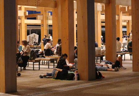 〔写真説明〕大阪メトロ中央線が運転見合わせとなった影響で、大阪・関西万博会場の大屋根リングの下で休む来場者たち=14日未明、大阪市此花区