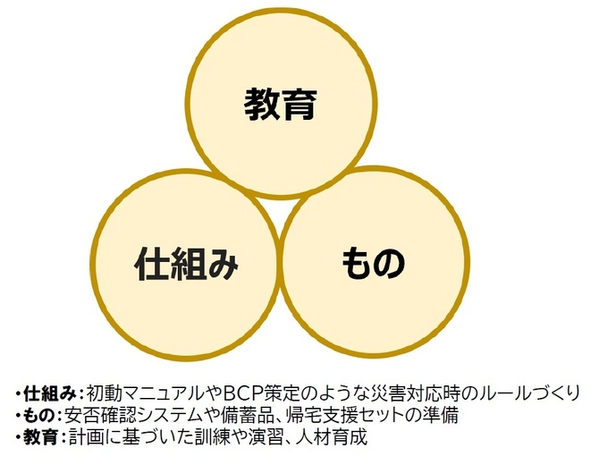 災害対応力向上には「仕組み」「もの」「教育」の3つのバランスが大事ですが、教育は後回しになる傾向にあります。