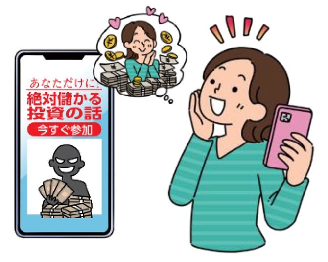 SNSの広告で投資を勧誘し、グループチャットなどで信用させてお金をだまし取る詐欺。