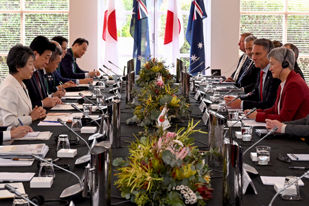 〔写真説明〕日豪の外務・防衛担当閣僚協議(2プラス2)に臨む上川陽子外相(左、当時)ら=2024年9月、オーストラリア・メルボルン近郊(AFP時事)