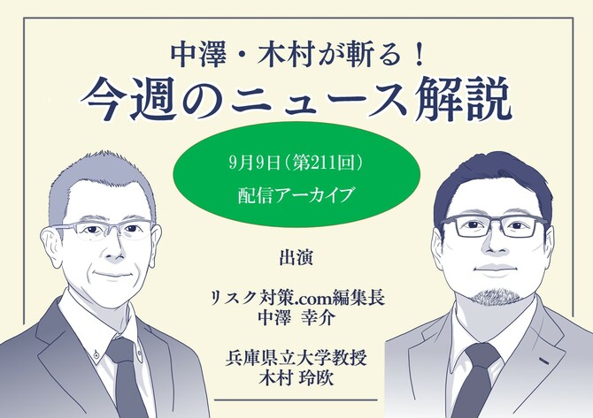 リスク対策.com編集長が、その週で最も注目するニュースを解説! 時事ネタに加え、リスク対策.comの特集や連載の中から、危機管理に携わる読者の皆様にぜひ知ってほしい記事を取り上げ、背景にある社会情勢や関連する動きなどを、独自視点で斬り込みます。パーソナリティは、心理学・危機管理学専門の兵庫県立大学教授の木村玲欧氏。