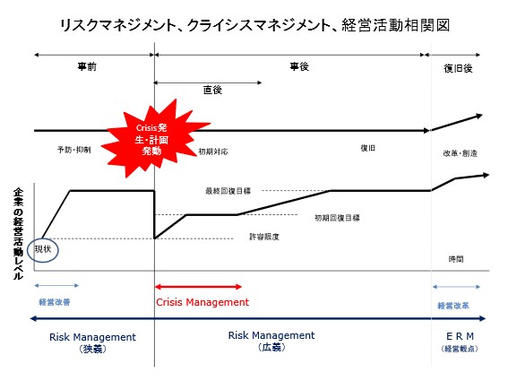狭義のリスクマネジメントは損失発生の可能性の防止を中心とします。人間の健康に例えれば平素の健康管理に相当します。一方、クライシス発生にどのように対応するかは、平素のリスクマネジメントとは別の対応が必要で、クライシスマネジメント(危機管理)と呼ばれています。平素の健康管理(リスクマネジメント)がいかに良くても人は病気になります。病気になったらどう早く治すかを事前に考えて用意することがクライシスマネジメント(危機管理)です。