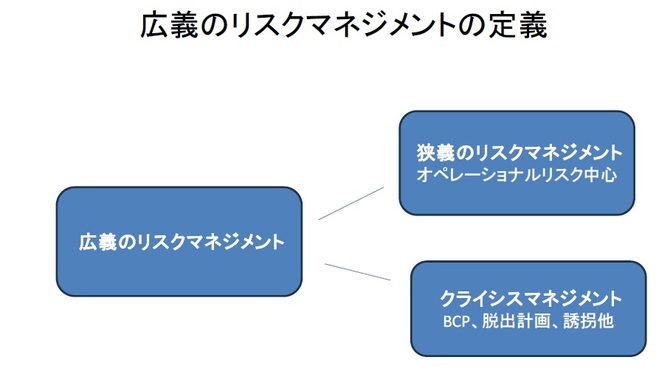 事業活動の観点からみると、狭義のリスクマネジメントの定義は「事業活動の遂行で損失が発生しないように一連のリスク管理を行い、損失発生防止を中心とする狭義のリスクマネジメント」と「ストライキ、地震、大規模なデモ等の事業活動で重大なクライシス(危機)が発生した場合にその損失を最小限に抑えるように対応するクライシスマネジメント」の両方を包括した概念となります。これが「広義のリスクマネジメント」の定義となります。