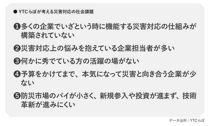 YTCらぼ(東京都墨田区)は、企業向けに防災・BCP教育、コンサルティングを行うベンチャーだ。NTTグループで災害対応リーダーの育成に携わってきた藤田幸憲氏が独立、起業した。人と組織をゆるやかにつなげ、互いの情報や知見を共有しながら、いざというとき機能する態勢を探究する同社。起業の背景と理念、目指すゴールイメージを聞いた。