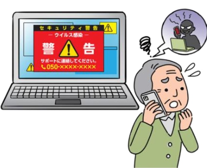 「ウイルスに感染した」などの嘘の警告画面で驚かせ、有料サポートと称し、電子マネーカード等を購入させお金をだまし取る詐欺。