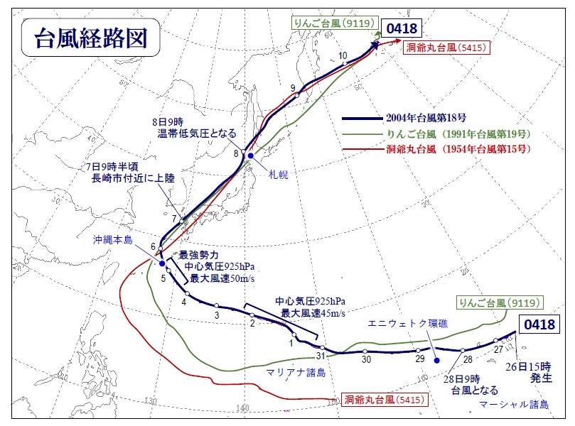 図1で、台風第0418号の経路と洞爺丸台風の経路を比較すると、秋田沖の北緯40度線を過ぎてからの経路がほぼ一致していることが分かる。強い台風が北海道の西岸に沿って北東進あるいは北北東進すると、台風の南東側に入る北海道では南西風が著しく強まり、暴風被害が大きくなりやすい。また、温帯低気圧に変化する過程で加速しながら勢力を強めたことも、台風第0418号と洞爺丸台風の共通点であった。
